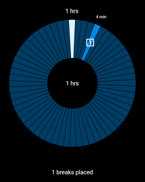 To set a notification (“break”), just click on a slice of the wheel. To unset it, click again. Each placed “break” gets a number as identifier, used as notification pattern. You will also see the duration when the break will be reached.